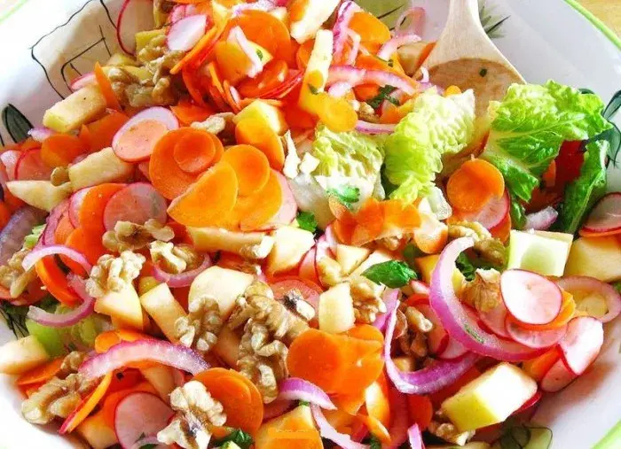 Poner a cocción el atún si no es de lata, por aproximadamente media hora, descartar y poner a reposar. Desmenuzar el trozo grande atún en la forma mas pequeña que puedas, o al gusto. En un olla de agua hirviendo colocar la zanahoria hasta que se ablande y este a punto. unir en un envase para ensaladas el atún ya frío o reposado, el maíz o choclo y los cuadros de zanahorias. Adicionar las tiras de cebolla ya cortadas, condimentar con sal y pimienta hasta que tenga suficiente sabor y combinar con especias como cilantro, perejil y hojas de céleri o apio España, adicionar la manzana cortada finamente. Una con el aceite de oliva y puede colocar zumo de limón o vinagre para dar toque de acidez y equilibrar sabores. Servir como snack vespertino con pan o galletas o comer con arroz y otros acompañantes, puedes decidir cómo comerlo dada la versatilidad de las formas de comer la ensalada mediterránea de atún.
