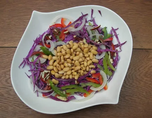 Las ensaladas pueden ser el plato principal, recetas especiales elaboradas con una buena carga proteica pueden sustituir una de tus comidas si estás en un régimen de reducción de peso o de calorías reducidas sin perder por supuesto los elementos nutricionales necesarios para el organismo, además los vegetales verdes crudos conservan sus minerales y proteínas siendo estos de fácil digestión y aprovechamiento. Comer crudo posee también sus ventajas nutricionales sobre una dieta cocinada, alternar métodos de cocción es otra herramienta importante de manejar. La soja ha sido siempre el sustituto vegetal de la proteina, Este alimento es muy alto en nutrientes. La soja es un alimento rico en fósforo también contiene una alta cantidad de vitamina B9 y B7; además de los mencionados anteriormente, la soja es también es un alimento muy rico en vitamina B6 y vitamina B5 y vitamina B1 y magnesio y zinc y potasio fibra y proteínas, la soja se encuentra entre los alimentos bajos en colesterol ya que este alimento no contiene colesterol, por lo que es la proteína de elección para cuidadr el sistema circulatorio y cardiovascular. Entre las propiedades nutricionales de la soja posee las siguiente cantidades de nutrientes: 6,60 mg. de hierro, 201 mg. de calcio, 6,30 mg. de yodo, 6,29 g. de carbohidratos, 4,70 mg. de sodio, 63,40 ug. de vitamina A, 0,27 mg. de vitamina B2, 7,90 mg. de vitamina B3, 0 ug. de vitamina B12, 3 mg. de vitamina C, 0 ug. de vitamina D, 1,50 mg. de vitamina E, 39 ug. de vitamina K, 373 kcal. de calorías, 18,30 g. de grasa, 5,67 g. de azúcar y 190 mg. de purinas.