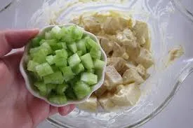 Este fabuloso plato de papas y apio, la salsa da un un sabor espectacular y algunas especias como el tomillo y el perejil, este plato es una comida completa y especial para regímenes para perder peso por su bajos niveles de grasa y su gran sabor, aunque su contenido en carbohidratos sea alto el plato en si mismo es favorable para dietas bajas en grasas y también para niños que gusten de mezclas de estas legumbres con huevos cocidos, es platillo familiar y también se le pueden colocar contornos para reforzar las proteínas que contiene, puede ser pollo o arroz. La mayonesa se puede sustituir por la veganesa