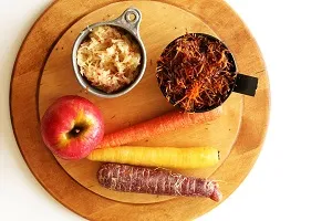 - 1/2 taza de puré de manzana sin azúcar o 1 manzana dulce, finamente rallado