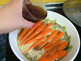 Comenzamos pelando las zanahorias y lavándolas muy bien para quitarles cualquier resto de tierra. En una sartén las marinamos con una cucharada de aceite de oliva. Salpimentamos. Luego añadimos el vaso de caldo de carne y el vaso de vino dulce. Bajamos a fuego medio-bajo y dejamos que se hagan dándoles la vuelta de vez en cuando. Cuando se haya consumido todo el jugo y comiencen a aparecer unas burbujitas apagamos el fuego y dejamos reposar unos minutos. Servimos en una bandeja con su forma de zanahoria o el palitos como sea el gusto. sirva a niños y adultos por general, el vino que adicionaste pierde el alcohol al contacto con el jugo o caldo caliente, de manera que las zanahorias glaseadas son adecuadas para niños y de igual modo para adultos.